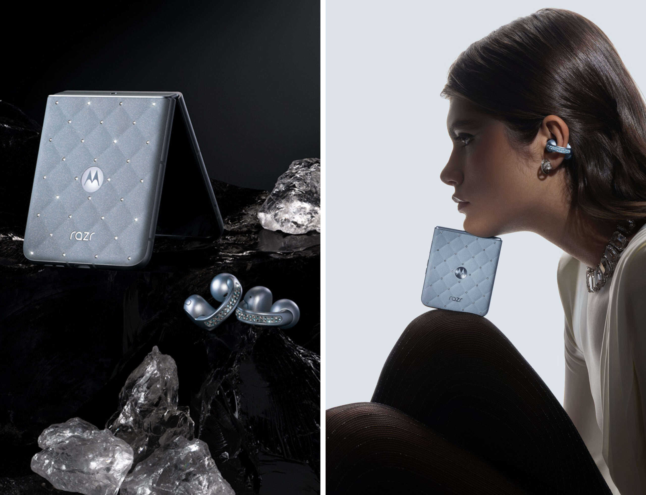 Motorola has partnered with Swarovski to adorn the new Razr foldable phone and Moto Buds Loop earbuds in a limited-edition bundle called the Motorola Brillian Collection. The pieces feature a striking Pantone Ice Melt finish, an icy blue tone with a subtle shimmer, designed to transform everyday technology into an elegant fashion statement.
