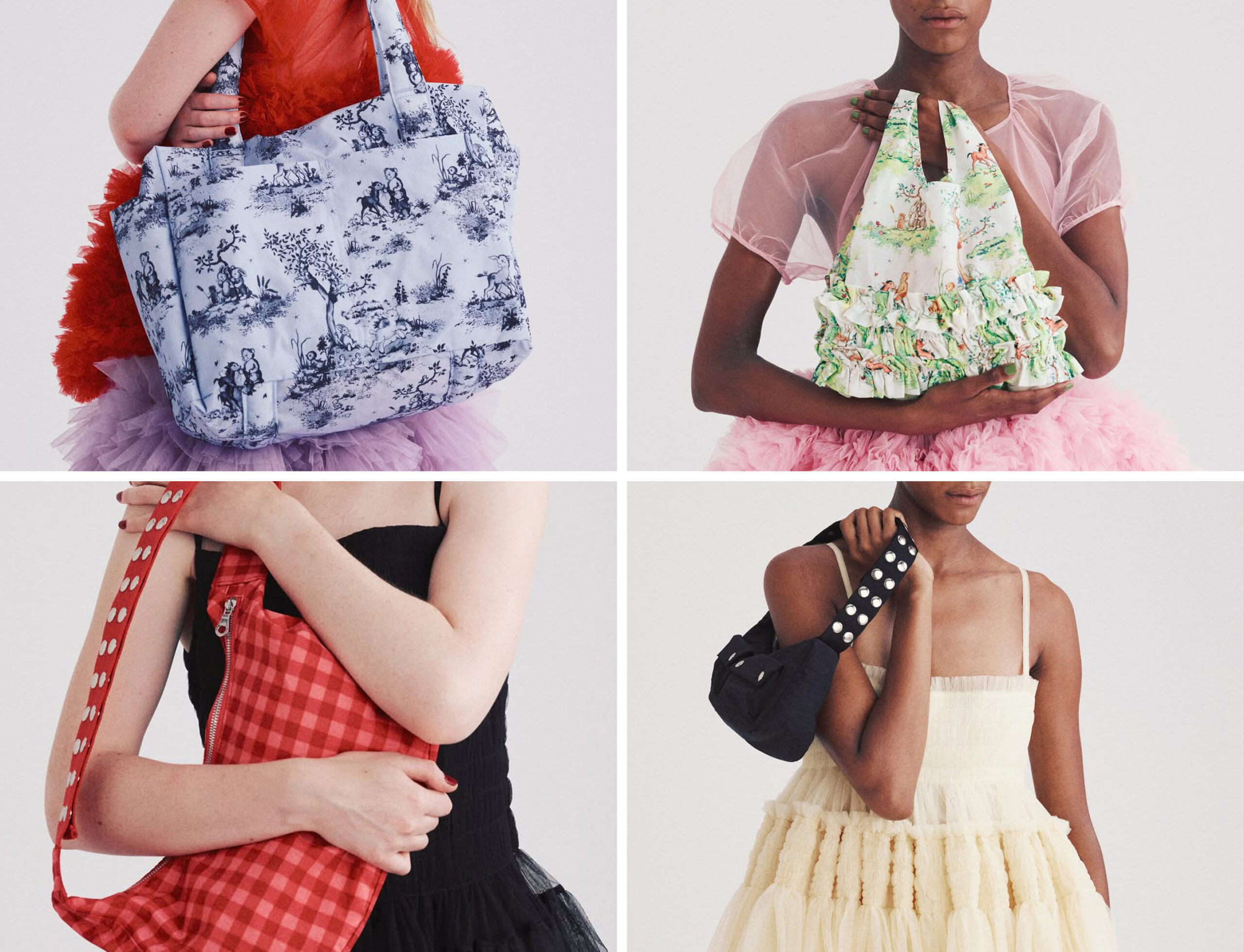 Renowned designer Molly Goddard, known for her voluminous ruffles, popper hardware and prints, has collaborated with BAGGU to bring her signature style to the brands latest collection of bags.