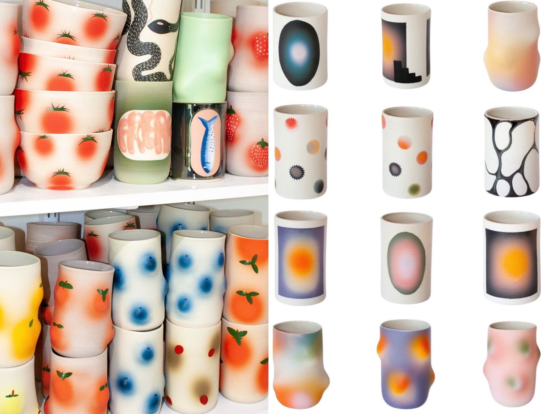 A Los Angeles based artist turns functional homeware into colourful, graphic and quirky statement pieces. Using an airbrushed technique as intentional motifs rather than your traditional ceramic glaze.