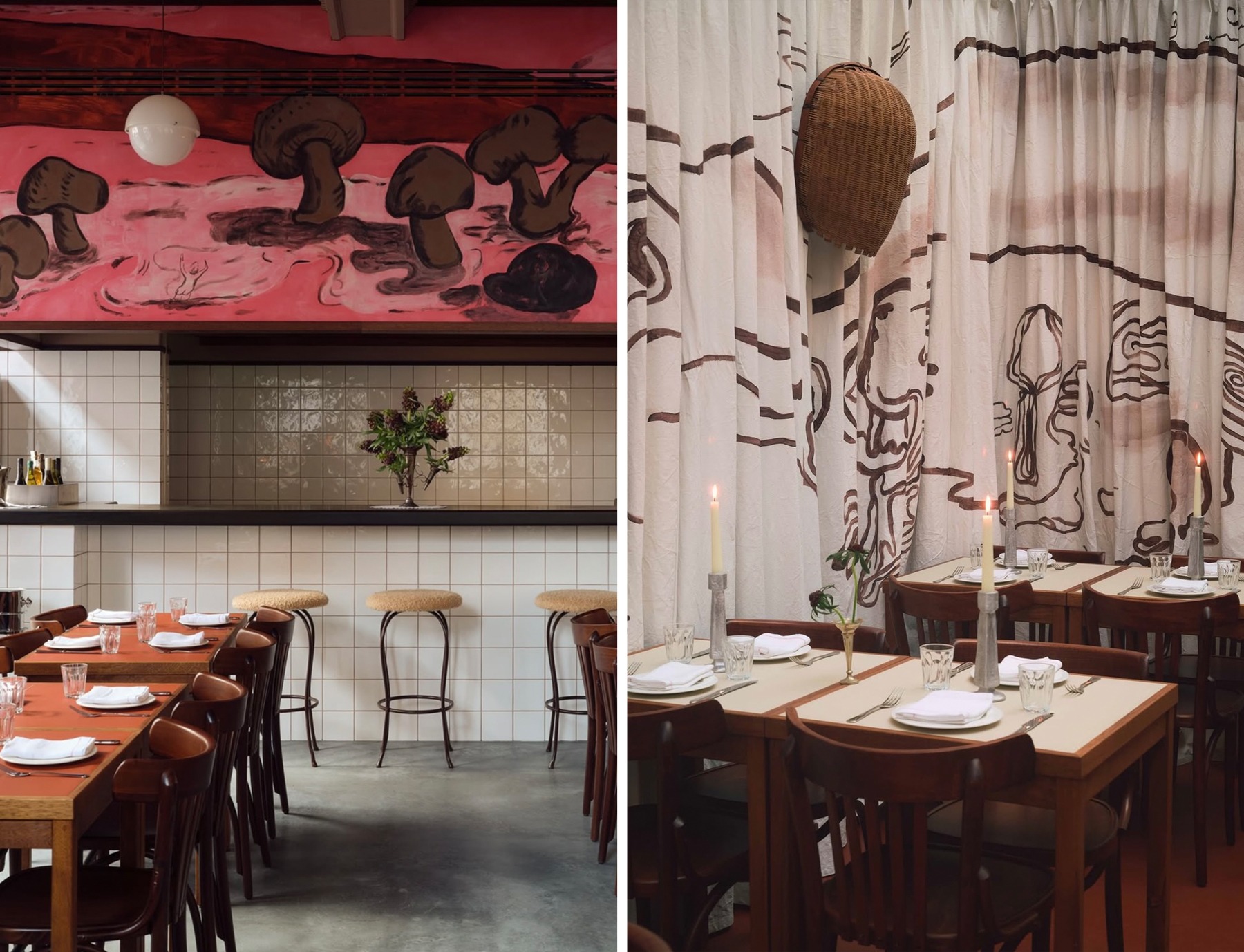 A collaboration between Holy Carrot x Faye TooGood merges art and interiors, with illustrated prints becoming the focal point of the dining experience. The hand drawn mushroom patterns appear on murals and textiles, adding narrative and proving how surface design can shape atmosphere.