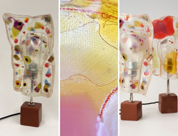 Marten Anderson designs translucent lamp forms inspired by his childhood, creating a layered iridescent plastic coating with sweet wrappers trapped inside as the basis…